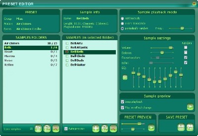 Больше нет необходимости покупать диски с записями звуков природы. В программе осуществляется генерация неповторяющихся звуковых тем на основе случайных повторений со случайными параметрами воспроизведения отдельных звуков из огромной коллекции качественных сэмплов, что позволяет создавать реалистичный и неповторимый звук. Все пресеты разбиты по группам, чтобы можно было легко найти нужные пресеты, и так же легко добавить (включить) их в выбранную звуковую тему.